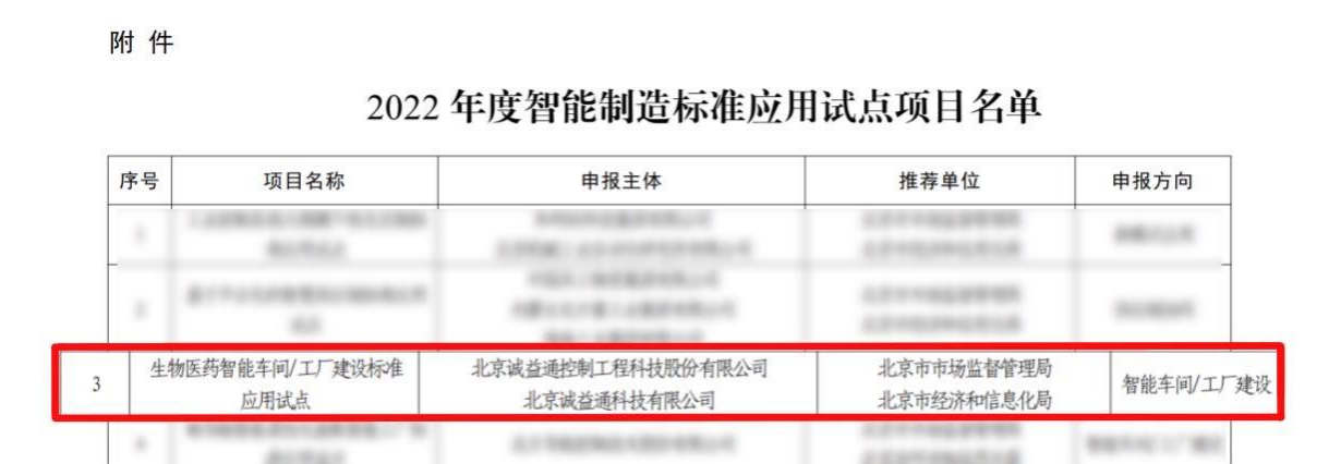 近日,國家市場監督管理總局國家標準化管理委員會、工業和信息化部聯合下達了《2022年度智能制造標準應用試點項目的通知》。北京誠益通控制工程科技股份有限公司聯合子公司北京誠益通科技有限公司建設的“生物醫藥智能車間/工廠建設標準應用試點項目”成功入選。